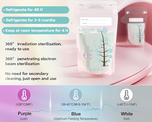 Baby Must Haves Spectra Milk Storage Bags: Worried about insufficient breastmilk storage bag capacity or serving milk at the wrong temperature? LXAIVNK breast milk bags has a generous capacity of 180ml (8oz), ideal for one meal for babies aged 3-6 months better than reusable freezer bags. The built-in temperature-sensitive indicator changes color to blue, ensuring milk is at the perfect temperature for feeding easy with portable bottle warmer for travel