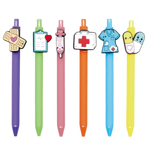 Cute Nurse Pen: The cute gel ink pens are made of plastic material, 6 pieces black ink pens with lovely pvc soft patch nursing decorations: medical kits, nurse’s uniforms, medicine bottles, stethoscopes, cute design with bright color, perfect pens for nurses, nursing students and nurse practitioner.