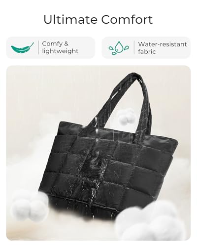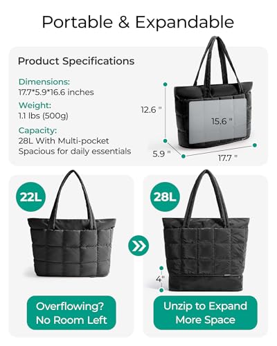 BAGSMART Expandable Tote Bag for Women, Puffer Work Tote Handbag, Quilted Carry-On Travel Gym Bag