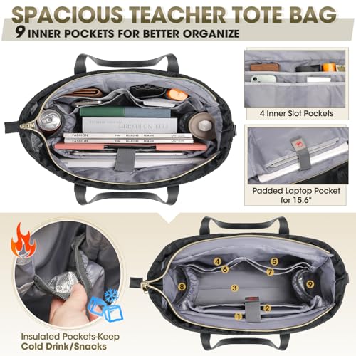 LARGE CAPACITY & MULTI-POCKETS: Spacious work bag has a total of 14 pockets, main compartment including thickened padded pocket that can accommodate a laptop(15.6″) and tablet, two insulated pockets keep food warm and cold and 4 slots to keep teacher bag organized. Two front zipper pockets store book or folder for easy access and two elastic side pockets can store umbrella or water bottle. In addition, an anti-theft pocket on the back to better protect your valuables.