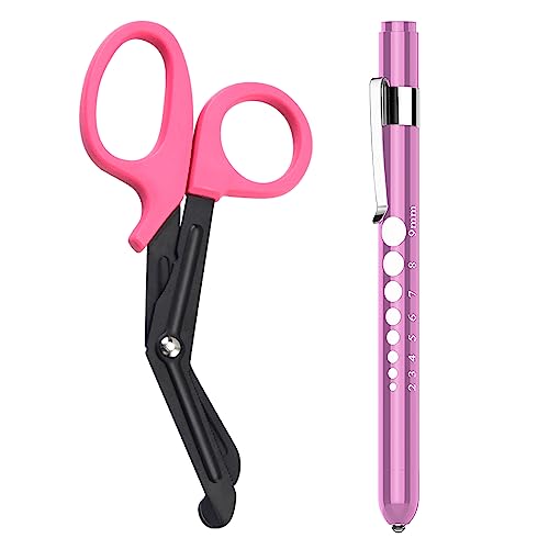 2 Pack Medical Scissors and Penlights for Nurses Medical Supplies with One Medical Pen light, One 6 inches Scissors Trauma Shears for First Aid EMT (Pink)