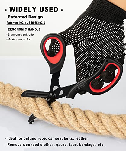 【ALL-PURPOSE SCISSOR】: Cut anything safely and efficiently with these sharp scissors. Ideal for cutting ribbon, burlap, rope, car seat belts, leather, remove wounded clothes, gauze, tape, bandages etc. Perfect for outdoors, first aid, nurse, doctor, firefighter, gardening, household.