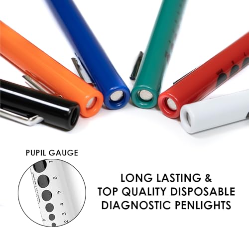 Primacare DL-9224 Pack of 6 Disposable Diagnostic Penlight with Imprinted Pupil Gauge, Lightweight and Moulded Plastic Body Medical Pen Light for Nurse, Student, Doctors EMT, Multicolor