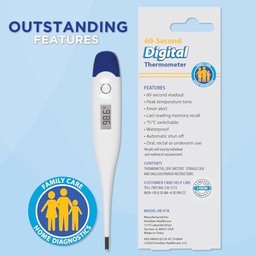 Veridian Digital Thermometer | 60-Second Readout | Fever Alert + Memory Recall| Clinical Rigid Tip | Hygienic Water-Resistant Easy Cleaning | Storage Case + Probe Covers Included