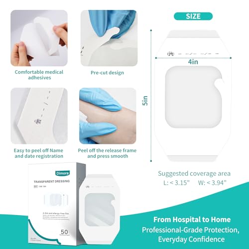 Dimora Transparent Film Dressing 50 Packs, Waterproof Adhesive Clear Bandages 4 in x 5 in, Wound Cover for IV Shield, Tattoo Aftercare Bandage,Clear Bandage Tape for Wound Care
