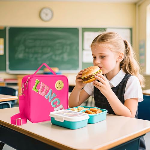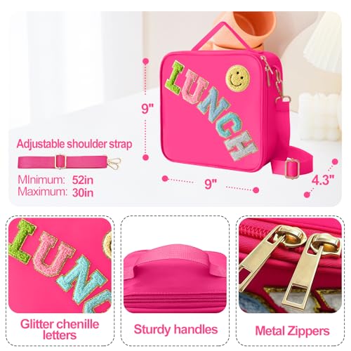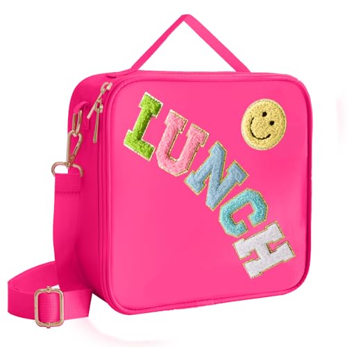 Insulated Lunch Bag With Adjustable Shoulder Strap, Nylon Lunchbox Large Insulated Lunch Box Reusable Lunch Tote Bag with Smiley Preppy Lunch Bag for Girls Travel Picnic Office Working (Rosy Red)