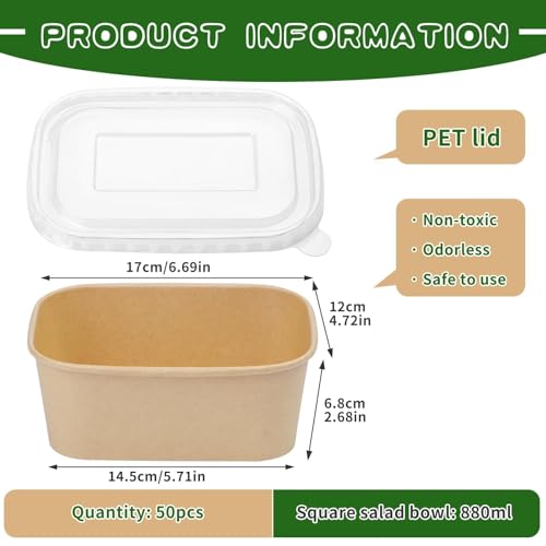 Paper Bowls Package Includes: The package contain 50 pieces of 29 oz disposable food containers and 50 pieces of lids, length about 17cm/6.69in, width about 12cm/4.72in, height about 6.8cm/2.68in, these disposable bowls are perfect for use in restaurants, kitchens, and for party food supplies