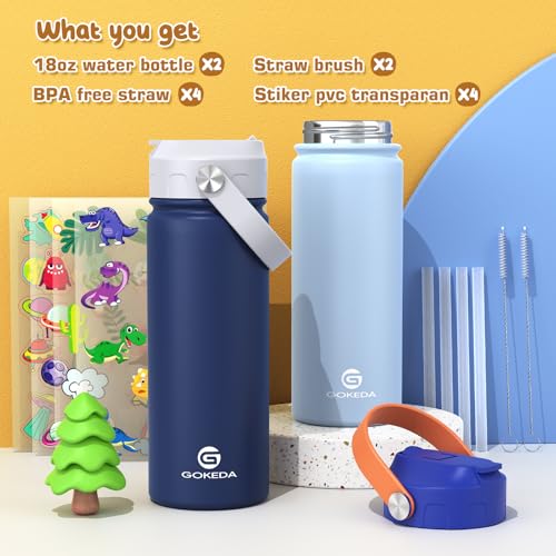 GoKEDA 18oz Kids Water Bottle, 2 Pack Insulated Bottles with Stickers, 18/8 Stainless Steel Vacuum Leak Proof Straw Cup for School, Gifts for Boys(Light Blue, Dark Blue)