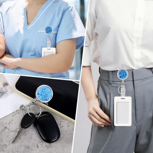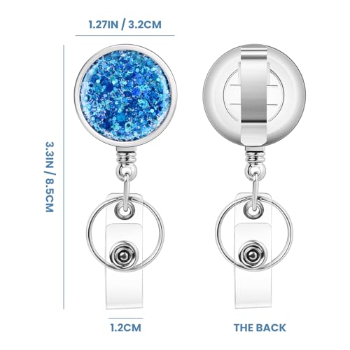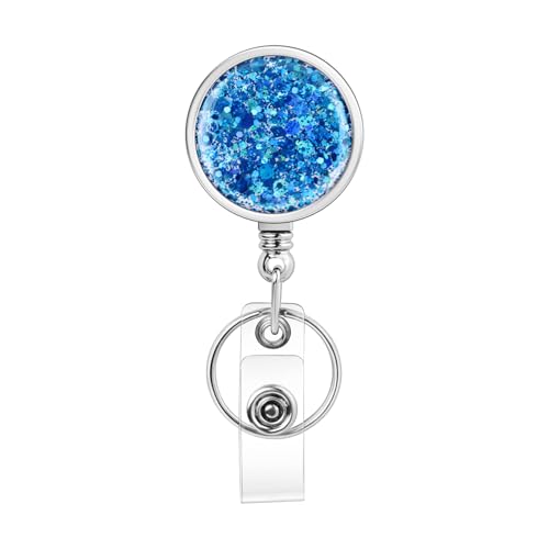 1 Pcs Plastic Glittery Retractable Badge Holder with Key Ring and Alligator Clip, Bling Sequins ID Name Badge Clip for Teachers, Students, Volunteers and Nurses (Bling Blue)