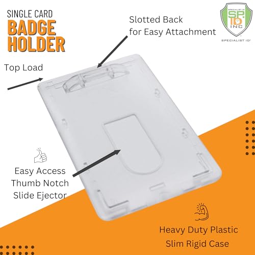 3 Pack – Slim Heavy Duty Badge Holders – Hard Plastic Clear Polycarbonate (Holds 1 Card) Rigid Top Load Single Card Case – Vertical Easy Access Thumb Slide Hole & ID Protection by Specialist ID
