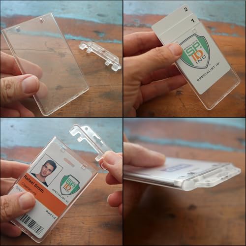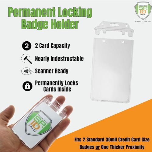 Permanent Locking Hard Plastic Badge Holder – Vertical Clear Heavy Duty Secure Case Holder for One or Two I’d Cards by Specialist ID