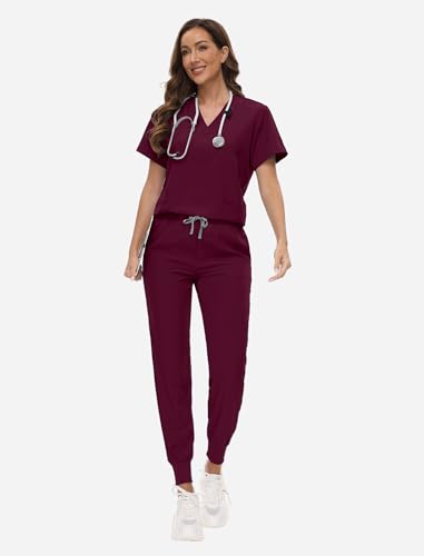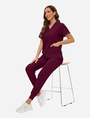 VIAOLI Scrubs for Women Set V-Neck Pocket Top & Drawstring Jogger Scrub Pants Stretch Nursing Scrubs Set Uniform
